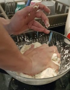 Une fois que tout est mélangé, on y met… les mains ! Et ouais faut pétrir la pâte sur le plan de travail hop hop ! Une fois qu’on a obtenu une boule (héhé..hé) style pâte à pain, on passe à l’étape suivante.
