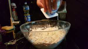 Mélanger tous les ingrédients dans un grand bol. Une grosse cuillère (ouais pourquoi pas la cuillère à soupe qui a dosé l’huile juste avant voilà super) ou bien une spatule fera l’affaire.